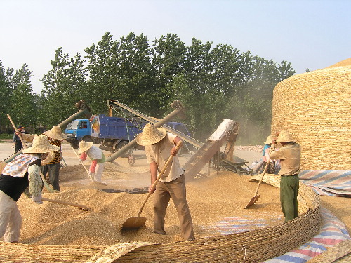 7月10日下午,在安徽省潘村湖农场五分场晒场,种子公司职工正在紧急转运储存在这里的小麦种子粮。