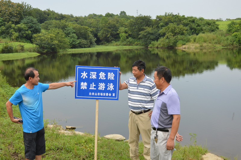 7月下旬以来,白米山农场安委会在全场范围内开展了夏季安全生产大检查,副场长王仕超率队全面检查了5个农业分场、4家租赁企业、3处金山花园小区、职工医院等重点部位的安全生产状况,重点落实了夏季防汛抗旱、防中暑、防雷电、防农药中毒、中小学生防溺水、农机管理、道路交通、安全用电等安全措施,对检查中发现的隐患进行了现场果断处置,采取了防范措施,还对场区道路、水库等永久性安全警示牌进行了加固刷新,在河湾、塘口增设警示牌50处。