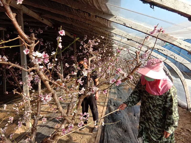 与此同时,在位于江南茶区郎溪县的农垦十字铺茶场3万亩茶园里,茶农们正在对茶树进行修边、打头、施肥,着手做好采茶准备。而在黄河故道旁边的砀山果园场果树大棚里,桃花、杏花竞相开放,职工正抓紧授粉。种植户周华萍说,“往年授粉都要雇不少人,今年由于疫情,防止扎堆,没有雇人,抢抓时间,争取授上粉,座上果,不减收。”目前果园场800亩大棚果树大部分已经完成授粉工作。