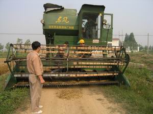 潘村湖农场今年午季小麦良种化率达到100%%。为确 保种子质量,该场采取多种措施,防止种子粮之间 因为人为原因混杂。图为场农技人员正在清扫转场 作业的收割机。(杨登宏摄)