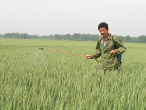 针对今年部分地块小麦吸浆虫虫害较为严重的情况, 潘村湖农场积极采取应对措施,发动全场各职工家庭 农场全力以赴展开防治工作.图为5月10日上午,六分 场青年职工蒋忠正在自家承包田里按照场农技部门 的技术指导,再次进行药剂喷施作业的情景.(杨登宏 摄)